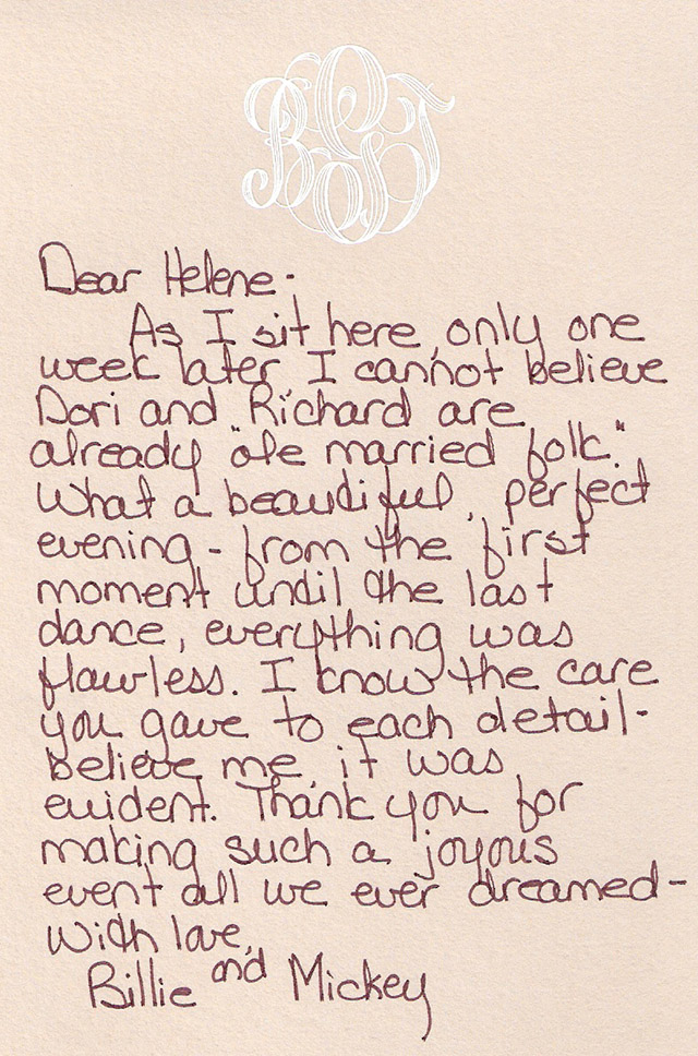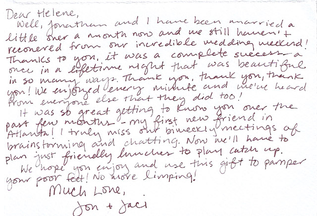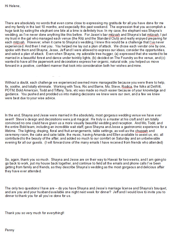 "HELENE...THANK YOU from the bottom of my heart for making the wedding weekend beyond all of my hopes and dreams. It was truly amazing!!!!!! I am pretty sure I am going to go through Helene-withdrawals now. I loved getting to spend time with you. Working with you was like working with family; as Neil pointed out I love my family. Thank you doesn't quite sum it up, but its all I can say at the moment."
