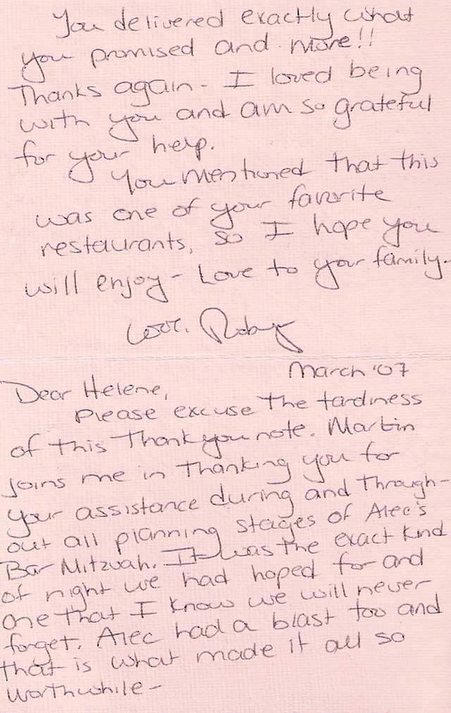 "Martin joins me in thanking you for your assistance during and throughout all planning stages of Alec's Bar Mitzvah. It was the exact kind of night we had hoped for and one that I know we will never forget."